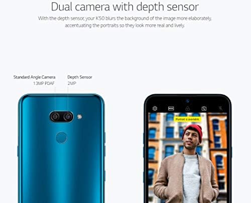 AI Cam artificial intelligence cameraThe camera with artificial intelligence (Al CAM) of your K50 analyzes objects or people on the screen, offering 8 different capture modes that optimize the colors and quality of your photography. Dual camera with depth sensorWith the depth sensor, your K50 blurs the background of the image more elaborately, accentuating the portraits so they look more real and lively. Dedicated button for Google AssistantPress the shortcut button only once and access Google Assistant. Doing so twice starts Visual Snapshot that shows the weather and other information from the Google Assistant. If you press and hold the button you can create a quick voice command. Military Standard Resistance CertificateThe durability of the K50 has been verified with rigorous tests used in the United States military industry. There are 6 categories of tests that include operation in high and low temperatures, thermal shock, vibration, shock and humidity.