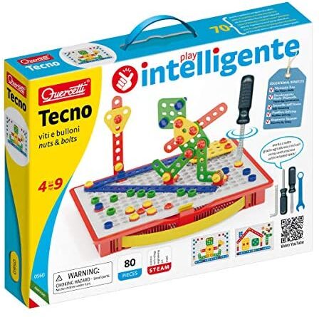 PRODUCT SPECIFICATIONS: Package contains (1) Quercetti Tecno – 80 Piece Building Set. Pegged Base, Storage box with handles, 60 screws, bolts & washers, 4 3D threaded elements, 4 basic tools, 11 2D threaded elements, instruction manual. Recommended for ages 4 and up.