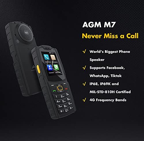 Rugged Phone Unlocked, AGM M7 4G LTE Dual SIM Phone with 35mm Super Speaker, IP68/IP69K Waterproof, AT&T, T-Mobile, Facebook/Whatsapp/Skype/TikTok, 2.4″ Touch Screen 1GB+8GB 2500mAh Battery Black