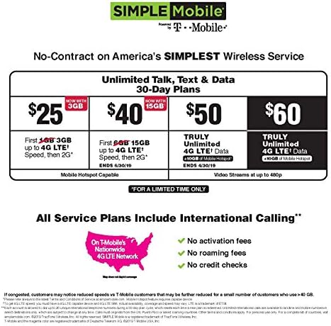 PLANS – Simple Mobile offers a variety of coverage plans, including 30-Day Unlimited Talk, Text & Data. No activation fees, no credit checks, and no hassles on a nationwide lightning-fast network. For more information or plan options, please visit the Simple Mobile website.