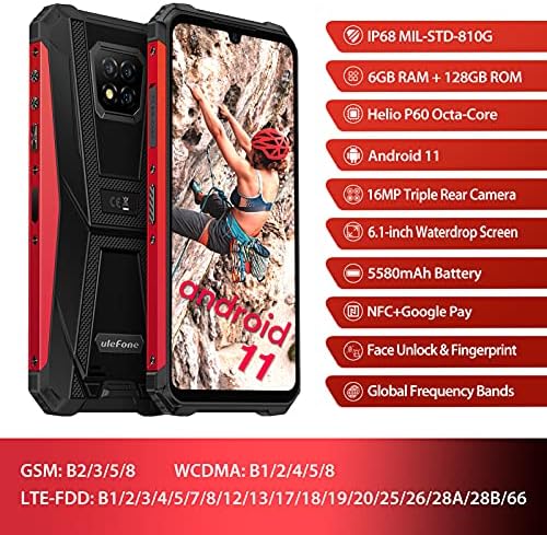 Ulefone Armor 8 Pro Rugged Cell Phones Unlocked, Waterproof Phone 6GB RAM 128GB ROM 1TB Expansion, 16MP+5MP+2MP Camera, Android 11 Octa-core, 6.1 inch Waterdrop Display, NFC, OTG, GPS, 5G WiFi, Red
